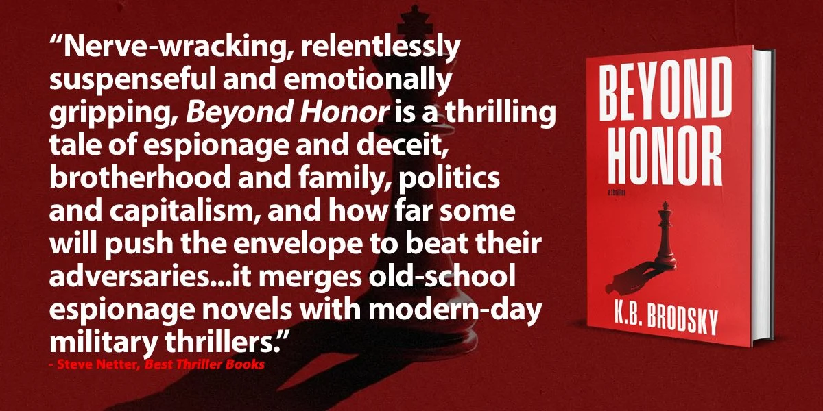 Nerve-wracking, relentlessly suspenseful and emotionally gripping, Beyond Honor is a thrilling tale of espionage and deceit, brotherhood and family, politics and capitalism, and how far some will push the envelope to beat their adversaries. K.B. Brodsky delivers an enthralling, nail-biting tale that pays homage to the great spy novels of years past with a contemporary edge.