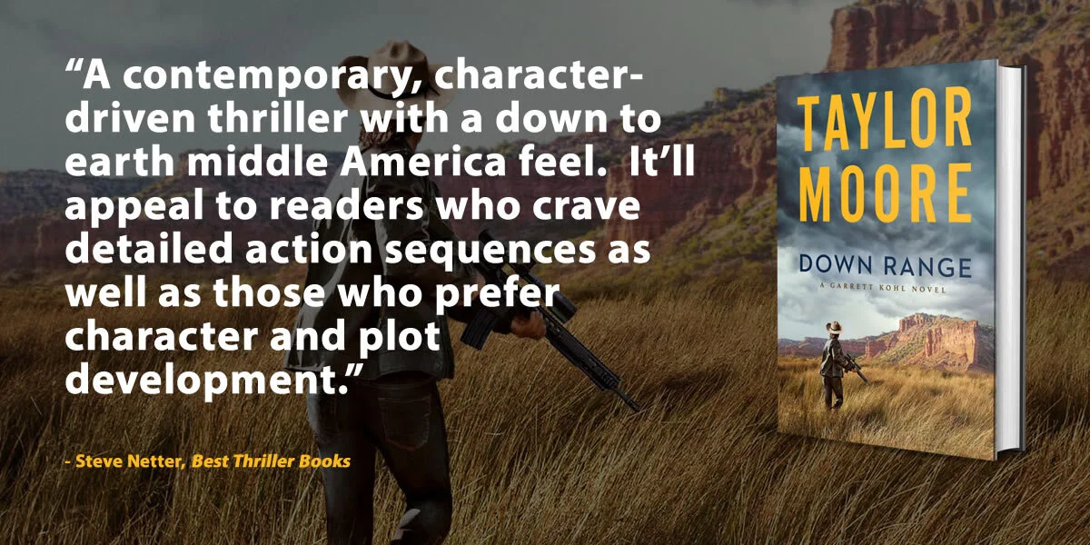Down Range is going to be a big hit with thriller fans. It’s a contemporary, character-driven thriller with a down to earth middle America feel. It’ll appeal to readers who crave detailed action sequences as well as those who prefer character and plot development. I promise that once you pick it up, you’ll have a difficult time putting it down. I have little doubt that this debut will catapult Taylor Moore and the Garrett Kohl series into must read status.