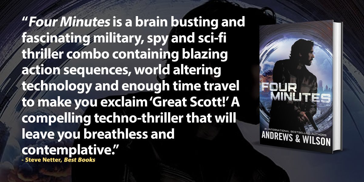 Four Minutes is a brain busting and fascinating military, spy and sci-fi thriller combo containing blazing action sequences, world altering technology and enough time travel to make you exclaim “Great Scott!” Andrews and Wilson have delivered another compelling techno-thriller that will leave you breathless and contemplative.