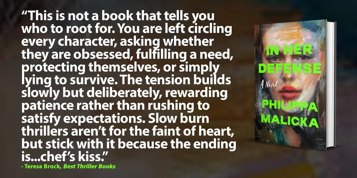 This is not a book that tells you who to root for. You are left circling every character, asking whether they are obsessed, fulfilling a need, protecting themselves, or simply lying to survive. The tension builds slowly but deliberately, rewarding patience rather than rushing to satisfy expectations. Slow burn thrillers aren't for the faint of heart, but stick with it because the ending is...chef's kiss. Philippa Malicka is officially on my radar, and if this is what her debut looks like, I am very ready for what she does next.
